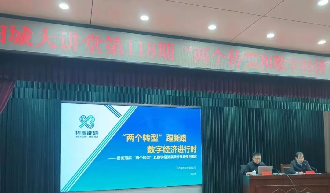 10月21日,山西省工商聯副主席、省數字產業協會支部書記、祥睿能源董事長王正通,作為我省“兩個轉型”會議發言代表,受陽城縣縣委、縣政府邀請,在陽城縣數字經濟專題講座上,以“兩個轉型”蹚新路,數字經濟進行時為題,就貫徹落實數字經濟和“兩個轉型”實踐進行了解讀,并結合全省數字經濟發展趨勢和要求以及當地資源特色,為陽城縣出謀劃策、支招賦能。陽城縣縣委中心組成員,各鄉鎮黨委書記、鄉鎮長,縣直單位主要領導,縣管企業負責人,開發區中層以上領導等參加,由陽城縣副縣長楊二強主持專題講座。